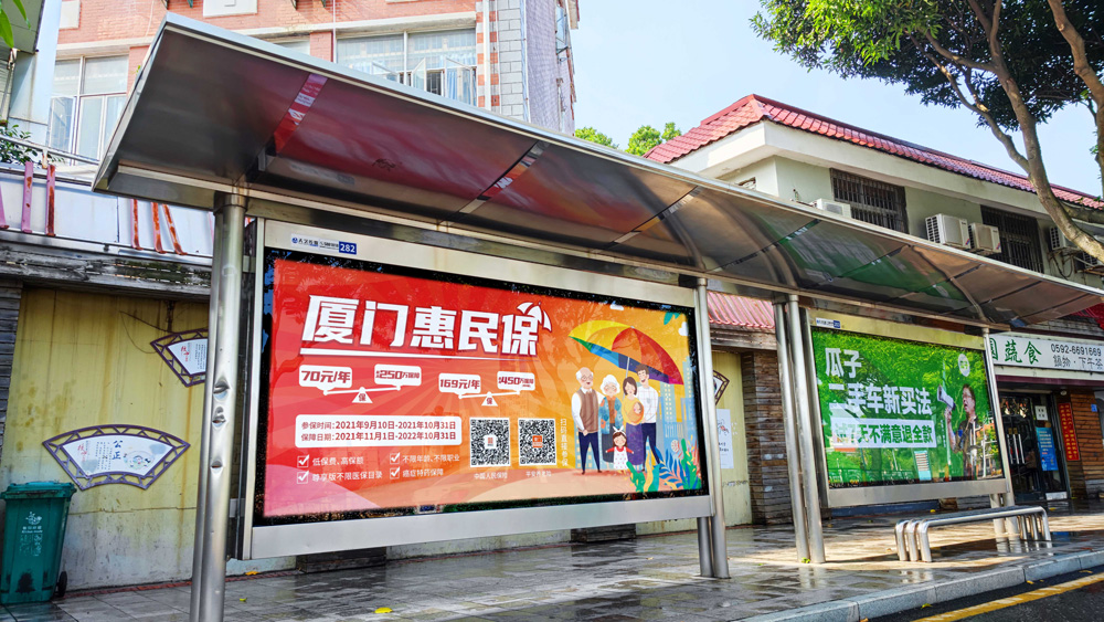 目前“惠民保”在全廈門市島內(nèi)外各個(gè)主干道及主干道交叉口、黃金的人流車流途徑處、居民生活住宅區(qū)等路段投放多個(gè)城市路名牌、公交車候車亭。