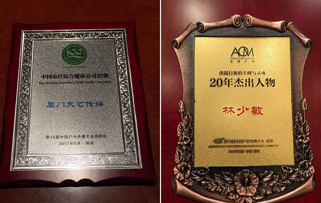 在剛剛落幕的第14屆中國戶外傳播大會上,廈門市天藝傳媒股份有限公司憑借20余年的媒體經(jīng)營實力、誠信可靠的行業(yè)口碑及強大的市場占有率,在第六屆中國百強媒體評選中,從眾多優(yōu)質候選企業(yè)中脫穎而出,榮獲“中國市區(qū)綜合媒體公司20強”稱號。作為戶外廣告行業(yè)的標桿人物,天藝傳媒董事長林少敏被授予“20年杰出人物”榮譽稱號!